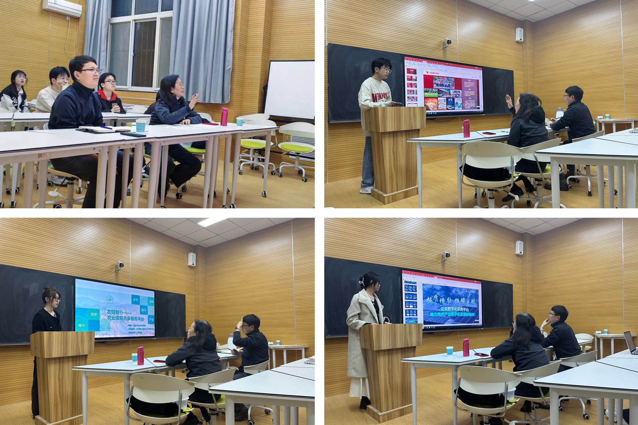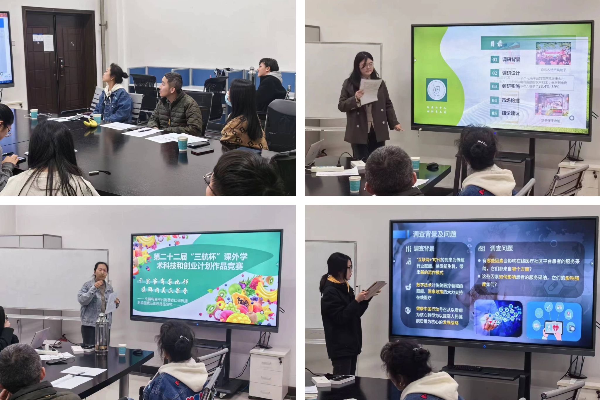 进入本次“三航杯”决赛阶段的14个团队分两组进行模拟路演汇报,每个团队按照正式比赛规则进行5分钟汇报,辅导老师进行20分钟点评指导。其中,创业组共有6个团队,王莉芳、王海啸重点从逻辑梳理、项目创新点、商业模式、核心技术、企业战略、PPT展示技巧、路演汇报技巧等方面进行了指导。创新组共有8个团队,王颖晖、李恒宇、巩雪重点就项目逻辑结构、项目创新性与特色、专业术语解释、PPT展示技巧、路演汇报技巧等方面提出了意见和建议。