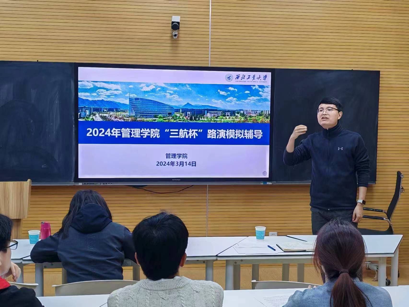 王海啸介绍了本次模拟辅导的目的,勉励全体参赛队伍要全力以赴、积极备战,以最好的竞技状态迎接决赛,力争在本次“三航杯”校赛中创造辉煌。巩雪详细介绍了比赛细则,并就路演中如何展示项目特色优势、把控汇报时间、注意仪容仪态等需要关注的要点进行讲解。