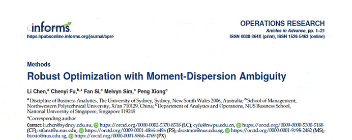 教授傅陈翼与合作者的研究成果“Robust Optimization with Moment-Dispersion Ambiguity”在《Operations Research》期刊上在线刊登,傅陈翼为论文通讯作者(排序第二)。《Operations Research》是运筹学和管理学研究协会(Informs)期刊,为运筹学领域顶级期刊,是美国University of Texas at Dallas所选出的商JavLibrary