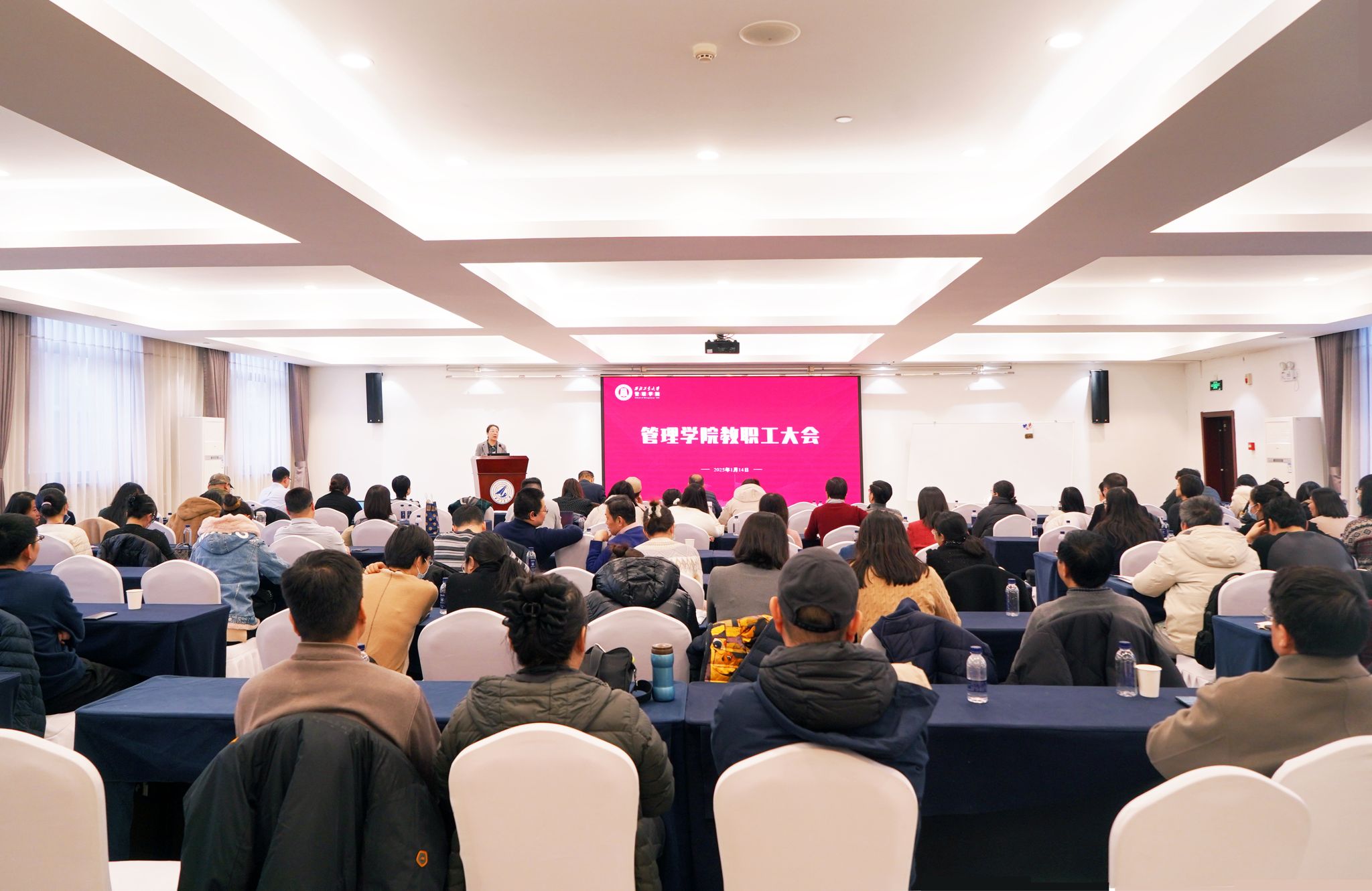 教职工大会上,副院长郭云涛通报专业学位课程、论文复试等培养的相关事宜。党委副书记王海啸通报学生就业情况、“三大赛”校赛备赛情况和寒假期间安全稳定相关工作。院长助理李乘龙对2025年海外引才项目进行宣讲动员。