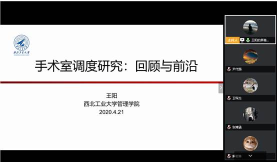 王阳副教授通过腾讯会议平台做了主题为“手术室调度研究:回顾与前沿”的专题报告,多位老师和各年级学生参与了本次线上学术讲座。
