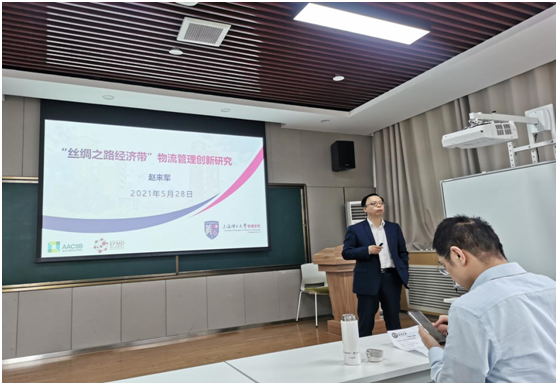 报告会开始,赵教授从“一带一路”倡议切入,介绍“一带一路”沿线国家具有资源禀赋各异、经济互补性强、合作空间广阔的特点,引出中欧班列在打造丝绸之路经济带、构建国际物流大通道中的重要地位。同时分析了中欧班列的发展现状、存在问题以及问题解决思路,即建立集拼中心。