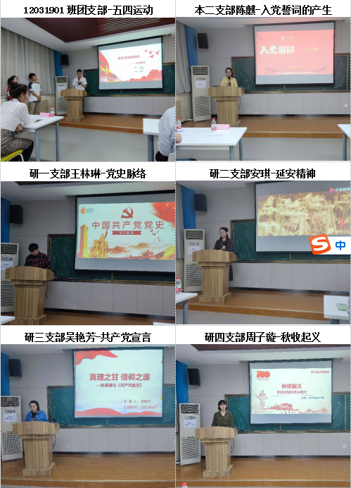 在比赛过程中,13位演讲者依次上台展示,紧紧围绕中国共产党历史,声情并茂地讲述建党故事、红色革命精神、英雄人物事迹等,再现了中国共产党发展的历史画卷。12031901班团支部成员深刻为大家讲解了五四运动的全过程;本二支部陈麒同志为大家分享了入党誓词的产生;研一支部王林琳同志从个人角度系统介绍了党史脉络;研二支部安琪同志为大家深情歌颂了延安精神;研三支部吴艳芳同志以信仰的光芒为主题进行了共产党宣言的讲解;研四支部邬佳、周子璇分别分享了共产党人永不磨灭的红色记忆——井冈山上的故事,秋收起义——中国革命新道路的伟大开端;研五支部刘鹏同志为大家生动地诠释了红船精神;研六支部贺娉同志饱满深情地讲述了国歌背后的故事;研七支部董永杰同志怀着无比激动自豪的心情讲述了香港回归的故事;研八支部王志义同志以激昂的心情歌颂了淮海战役的伟大胜利;研九支部侯金月同志为大家分享了伟大的历史转折点——遵义会议;研十支部唐美奂同志以为中华之崛起而读书为主题讲述了周恩来同志的故事。