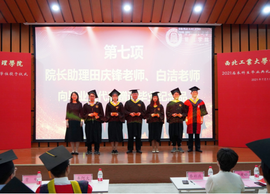 向毕业生代表赠送一枚刻有姓名的印章作为毕业礼物。以印代信,希望全体毕业生可以坚定理想信念,担负时代重托!