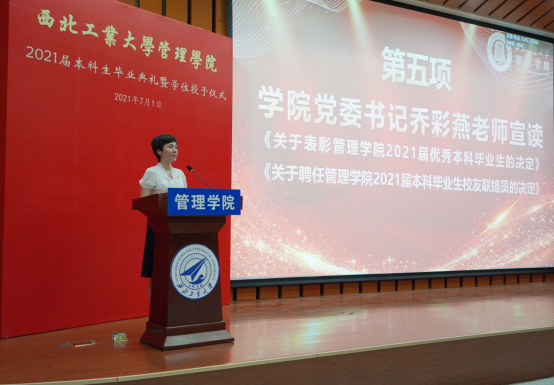 教师代表王莉芳教授为毕业生送上祝福与嘱托。她希望全体毕业生以梦为马,不负韶华,勇敢担当起国家、社会和家庭的责任。