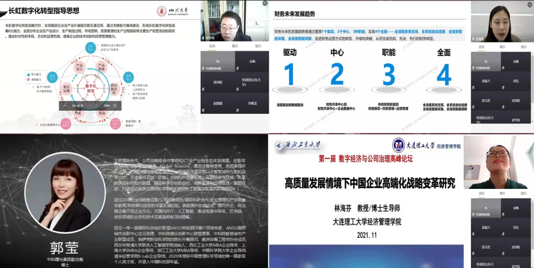 教授梁学栋、大连理工大学教授林海芬、中科曙光集团副总裁郭莹、中兴新云服务有限公司副总裁赵旖旎分别作了《实体企业数字化转型理论与实务》、《高质量发展情境下中国企业的高端化战略变革研究》、《数字经济环境下的企业发展战略》、《DT时代的财务变革》等四场专题报告。在平行论坛中,来自全国数十个高校的论文作者进行了报告和点评,分享了在数字经济、公司治理及交叉学科领域的最新研究成果、观点和未来畅想。