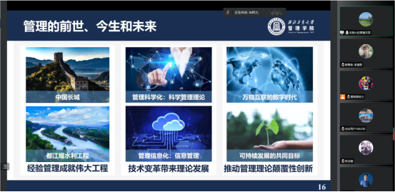 车阿大以“钱学森敏锐意识到运筹学在社会主义建设中的作用”及“钱学森将系统思想与系统理论运用于国防事业”的故事,指出在航空科研领域中“三分靠技术,七分靠管理”,以此表明管理学在国家发展中的巨大作用。并下出明确定义,即:管理是针对特定对象的研究,它通过系统角度思考问题,并运用管理科学的方法,从而使社会更加有序、高效!在“管理”定义的基础上,车阿大对目前“管理科学与工程”、“工商管理”两个大类下的学科建设情况做以简要介绍。从长城、水利工程,到技术变革背景下的信息管理,甚至是可持续发展愿景下的低碳管理,通过这一脉络讲述了管理的前世、今生和未来,新生们对管理有了更加深入的了解和更加宏观的把握。