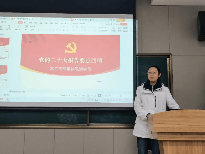 邢露淇同志向大家介绍了党的二十大会议背景和会议主题,并详细介绍了二十大报告的十五条主要内容,让大家对该报告有了全面而深入的学习与理解。