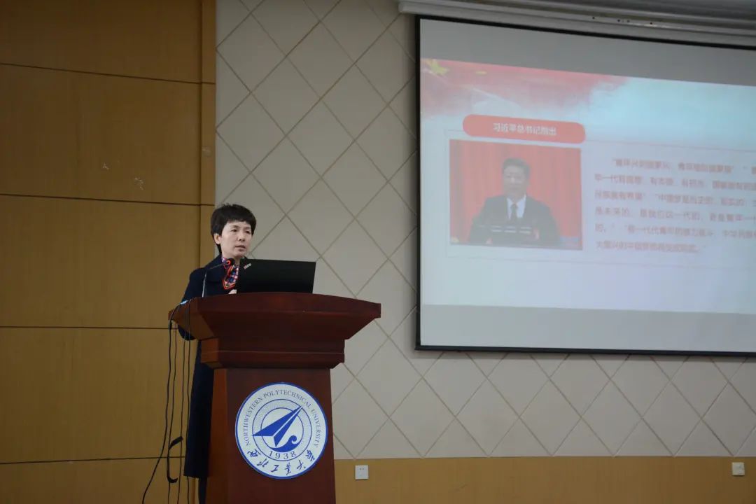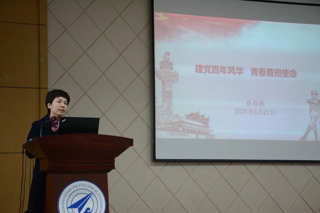 党委书记乔彩燕以“建党百年风华,青春勇担使命”为主题,进行党课的传授,首先讲到党的百年历程,从一艘南湖小船到世界上第一大政党,这是筚路蓝缕、披荆斩棘、艰苦创业、砥砺前行的一百年。这百年中,我国取得的历史性成就证明,中国共产党所具有的无比坚强的领导力,是中国人民最可靠的主心骨。接着,她从“有远大理想追求”、“有科学理论指导”、“有选贤任能机制”等六个方面介绍了中国共产党的优秀品质,为中国共产党为什么能取得如此大的成就做出了最好的解释。最后,乔彩燕书记对我们青年人提出了嘱托与要求,作为西工大人,理想信念是核心,责任担当是关键。