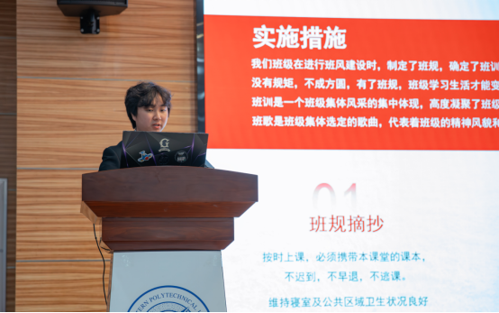 大赛现场气氛热烈、轻松愉悦。参赛的6个班级都精心制作了PPT,从班徽、班旗、班服设计,到班规班训的制定,再到破冰活动的开展,全面展现了各个班级的文化建设。