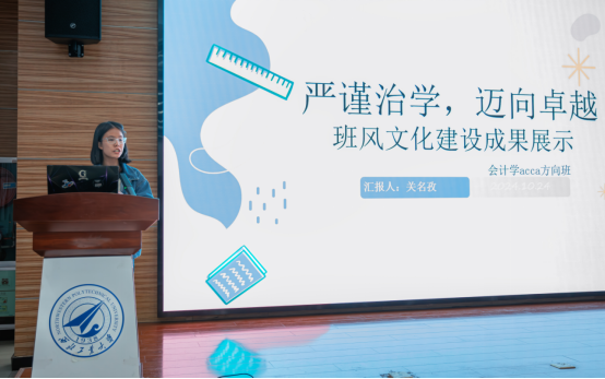 “奋力向前 未来可期”。会计学ACCA方向班带着他们的理想走上舞台,独特的情景剧表演展现了丰富的想象力和创造力。团日活动、主题班会、校史校情学习等校园生活点滴片段勾勒出一个新生班级建设的雏形。最后,一首《我的未来式》结束了班级风采展示,也开启了寻梦新征程。