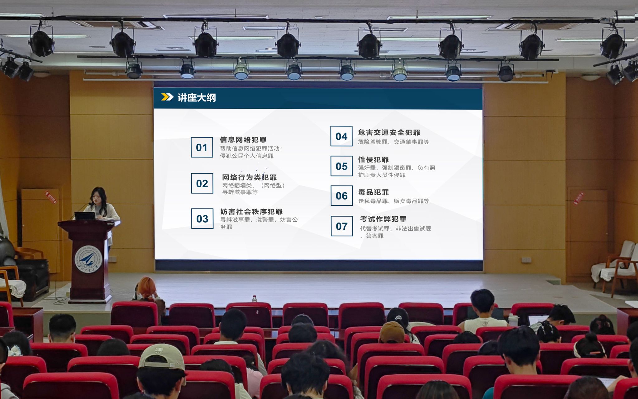 讲座中,王家瑶律师围绕“案例解析+法律阐释”,对七大刑事法律风险领域展开体系化解读。针对信息网络犯罪防治,她以“帮信罪”“侵公罪”等高频犯罪类型为切入点,通过剖析学生误入诈骗歧途的真实案例,揭示网络兼职陷阱与个人信息滥用风险,警示青年学子筑牢法律防线。针对性犯罪和毒品犯罪,她既从犯罪构成要件层面廓清法律边界,又结合司法实践提出具体防护建议,倡导青年群体树立“自我保护与尊重他人并重”的法治观念,实现犯罪预防与权益保障的双向赋能。