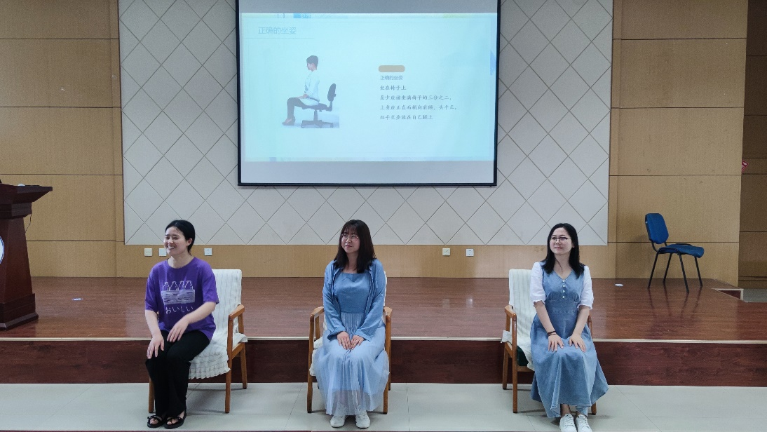 最后,为了让到场的同学能亲身体会仪态,叶子老师设计了互动环节。当场让同学们体验行走、坐的体态礼仪,为同学们纠正错误的体态,同学们的积极性都非常高。经过两三次的锻炼,同学们从一开始的姿势僵硬、不自信,到落落大方、十分自信,效果十分显著。
