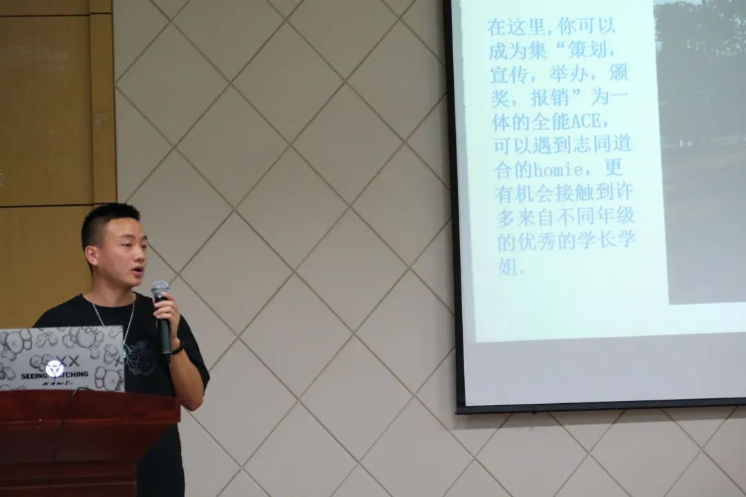 接着,苏斯杰讲到文体中心工作之余的部门日常,包括丰富多彩的团建活动、每逢佳节时的互赠礼物、学姐学长的幽默风趣。最后,文体中心诚挚向新生们发出邀请,期待同学们在这里闪闪发光。