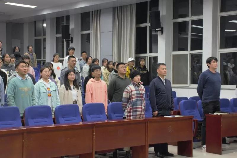 会议伊始,全体师生起立高唱国歌,共同抒发对祖国的祝福。