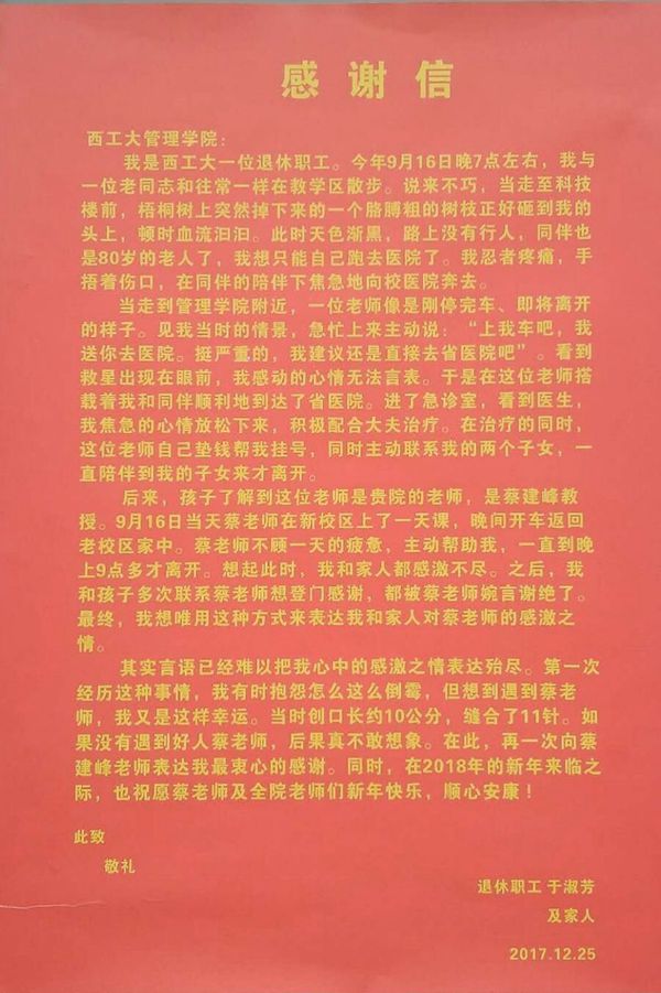 蔡建峰教授路遇,主动驾车送于淑芳老人去省医院就诊。到医院后,垫钱挂号帮助于淑芳老人就诊,并联系其子女,直到她的子女到达医院蔡老师才离开。后于淑芳老人及其家人多次想登门感谢被蔡建峰教授婉拒,于是写下这封温暖的感谢信。作为一名教师,蔡建峰教授学识渊博、教书育人;作为一名党员,心怀大爱,热心帮助他人。可谓一言一行,为人师表。这种助人为乐的精神,让人感动,更值得大家学习。