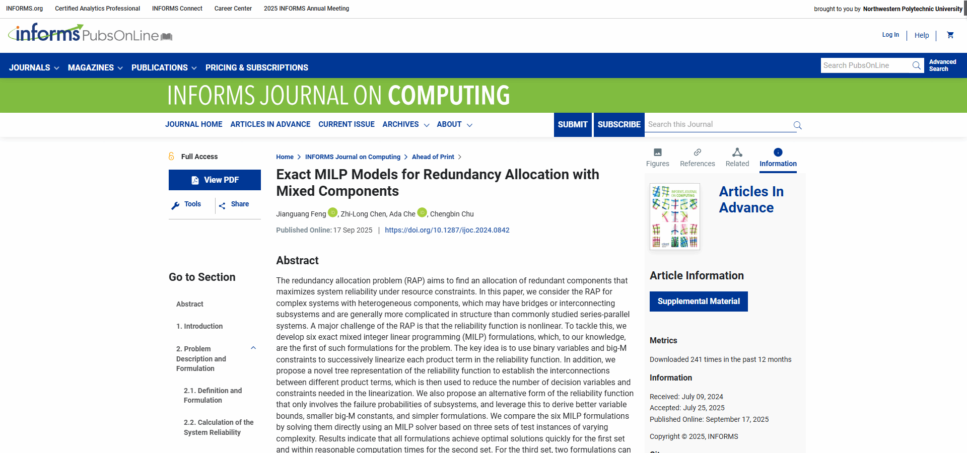 近日,《INFORMS Journal on Computing》期刊在线刊发了JavLibrary 冯建广副教授的研究成果“Exact MILP Models for Redundancy Allocation with Mixed Components”,JavLibrary 副教授冯建广为论文第一作者、车阿大教授为论文通讯作者。该研究聚焦于系统设计中的冗余分配问题(RAP),这一问题旨在有限资源条件下,通过合理配置冗余部件来最大化系统可靠性。本研究针对包含异质部件和复杂结构的情境,提出对非线性可靠性函数的逐步线性化方式,构建了多种精确混合整数线性规划(MILP)模型,并通过树形结构表示大幅减少模型的决策变量与约束数量。计算结果显示了所开发模型与方法的高效求解性能,尤其在大规模复杂系统中表现出稳健性和可扩展性,显著优于现有分支定界方法。