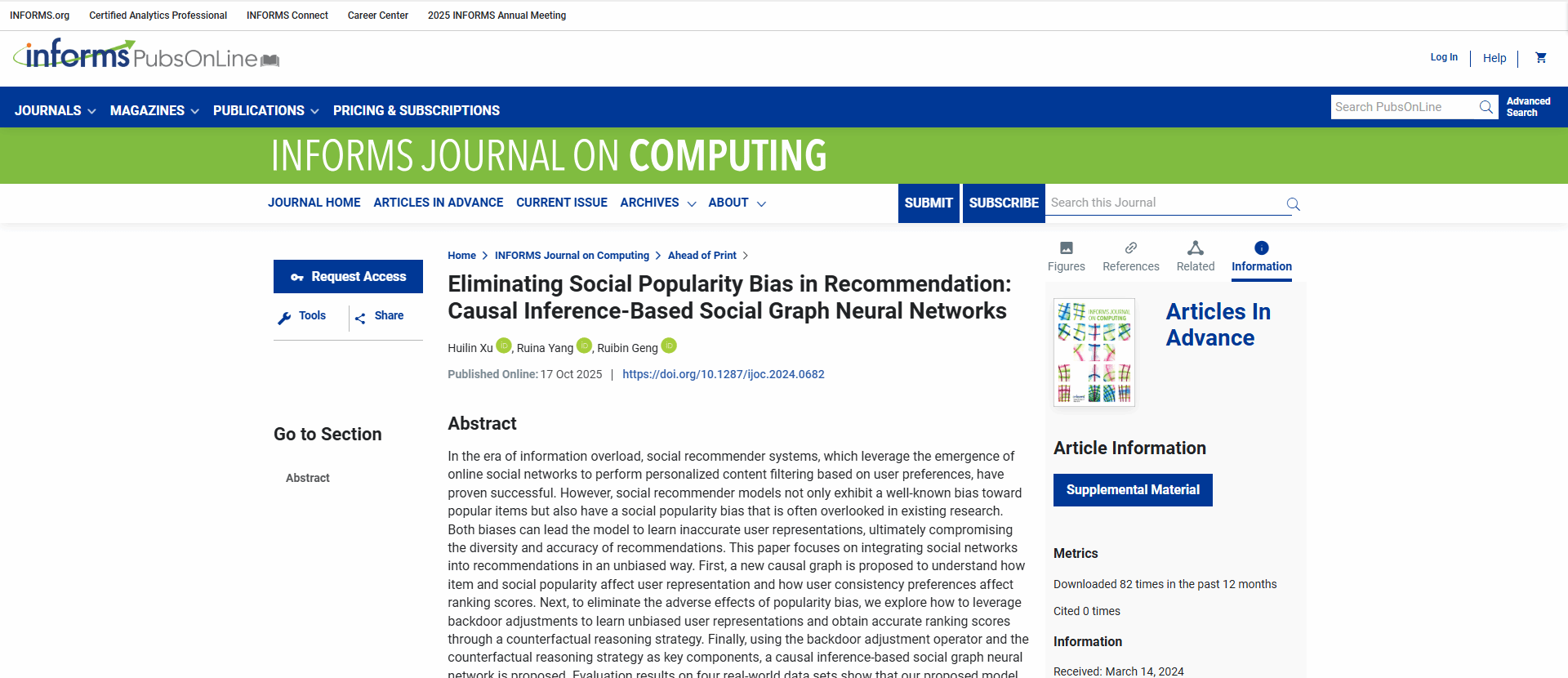 近日,国际运筹学与管理科学学会(INFORMS)旗下期刊《INFORMS Journal on Computing》在线发表了JavLibrary 副教授、博士生导师耿瑞彬与合作者的最新研究成果——题为 “Eliminating Social Popularity Bias in Recommendation: Causal Inference-Based Social Graph Neural Networks”(《消除推荐系统中的社会流行度偏差:基于因果推理的社会图神经网络》)的论文, 耿瑞彬副教授为通讯作者。该研究聚焦于社交推荐系统中的“社会流行度偏差”问题。传统推荐算法容易偏向热门内容,而在社交网络环境中,这种偏差会被“社会影响力”进一步放大,导致推荐结果集中于意见领袖或高影响力用户关注的内容,从而损害信息多样性与公平性。