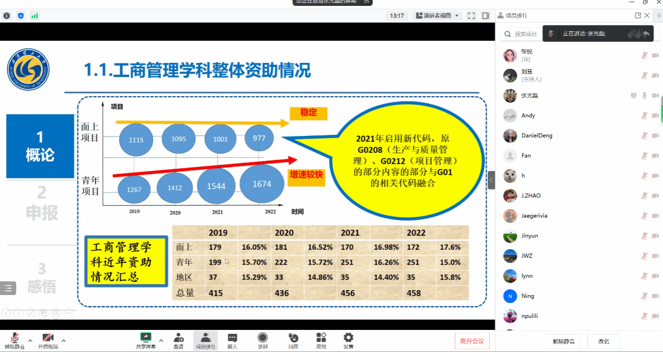 此次讲座中,张光磊教授首先全面系统地介绍了工商管理学科自然科学基金申请的整体概况,然后深入分析了工商管理学科的国自科项目的资助情况、代码选择规则及技巧;而后,张光磊教授结合自己在基金委挂职工作的经验,为大家详细深入分析了基金申报书的题目、研究基础、申请书质量对申请成功率的影响等十分实用的信息,参与讲座的师生收获颇丰。在讲座的互动环节,会议评论区的留言不断,互动活跃,张光磊教授针对大家的提问做了详细的回答。