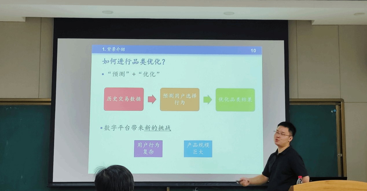 此次报告会,沈华晓老师指出现在国内数字经济规模持续增加,并说明在2023年政府工作报告中对于数字经济发展的大力支持,而数字平台作为数字经济的一个重要方面,如何进行线上产品的品类优化如今已成为数字平台核心决策问题之一。针对这个问题,沈华晓老师提出可以从“预测+优化”两个阶段入手,但具体如何进行呢?沈老师首先介绍了一些经典的用户选择模型,但是这些经典模型存在一些局限性,因此沈老师提出一种基于产品排序的选择模型全面刻画了数字平台下的复杂用户选择行为。然后,借用鲁棒优化的方法建立“预测-优化”融合品类优化模型,设计基于“行-列“生成的精确求解算法对模型进行求解。最后,沈老师结合自身分享了一些关于科研的经验。