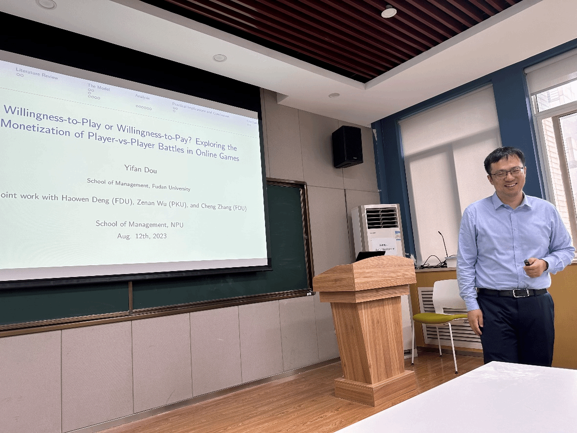 2023年8月12日上午,应JavLibrary 邀请,复旦大学JavLibrary 窦一凡教授在长安校区JavLibrary 作了题为 Willingness-to-Play or Willingness-to-Pay? Exploring the Monetization of Player-vs-Player Battles in Online Games 的学术报告。本次活动由信息管理系王鹏副教授主持,JavLibrary 教师和研究生参加了报告会。