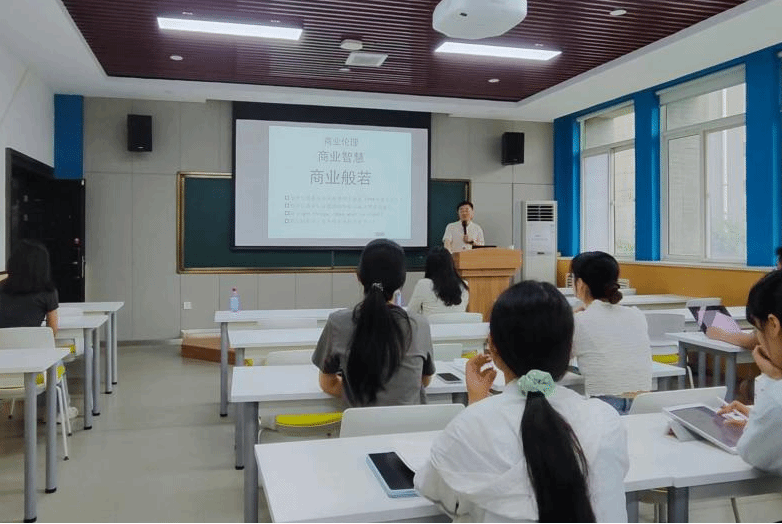 报告会伊始,主持人张莹老师对辛杰教授的研究方向、科研成果及学术贡献等进行了介绍,参会师生对辛杰教授的到来表示了热烈的欢迎。报告中,辛教授首先从企业伪善、商业本质等引人深思的点出发,提出了商业伦理、商业智慧、商业般若三个层层递进的概念,并融入到中华优秀传统文化的深厚意蕴中。其次,辛教授详细梳理了中华优秀文化的脉络,提炼出其中最根本、最精华、影响最深远的内容,同时对中西方思维的本质特征进行辩证分析,并辅以生动贴切的实际案例讲述。再次,辛教授分享了自身关于“企业社会责任与仁孝文化”的主题研究,通过案例质性研究的方式,试图探索中国企业社会责任的独特理论框架和履践范式。最后,辛教授再次强调,中国学者要从中华优秀文化的根脉中汲取力量,做有生命力的研究。