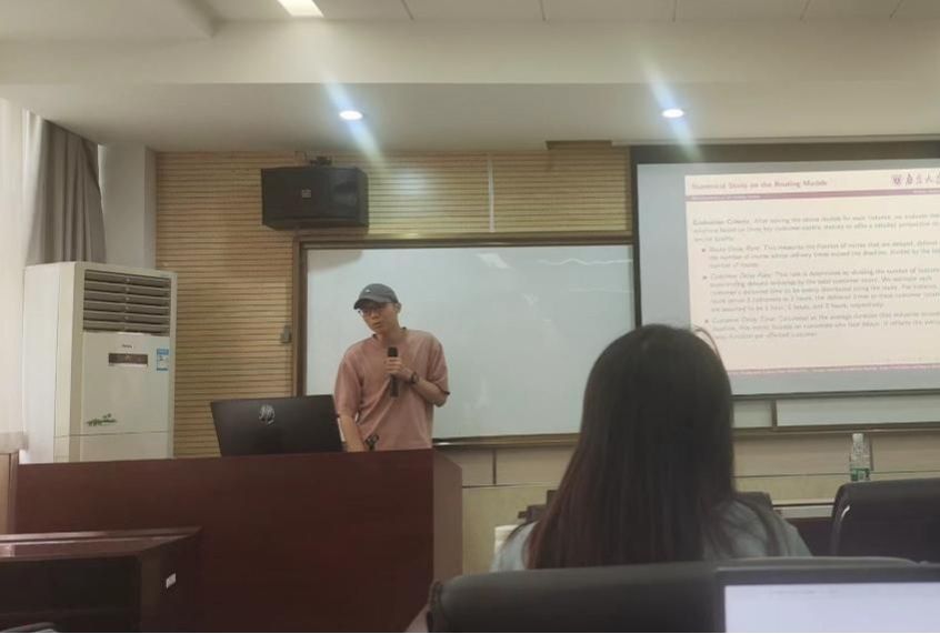 罗志兴教授首先介绍了团队组成与最新研究状况,然后分享了目前研究的城市配送路由规划问题并简单介绍了背景,以及指出该问题的着重点是时间。面对配送时间的不确定性和人的隐私保护问题,决定采用多个特征值(比如配送数量、送货员配送历史配送路线等等)组合数学模型去对配送时间进行拟合。继而利用该数学模型构建确定性的线性规划模型,并使用Benders算法进行求解,最后通过多方面比较展现了所使用方法的优势。