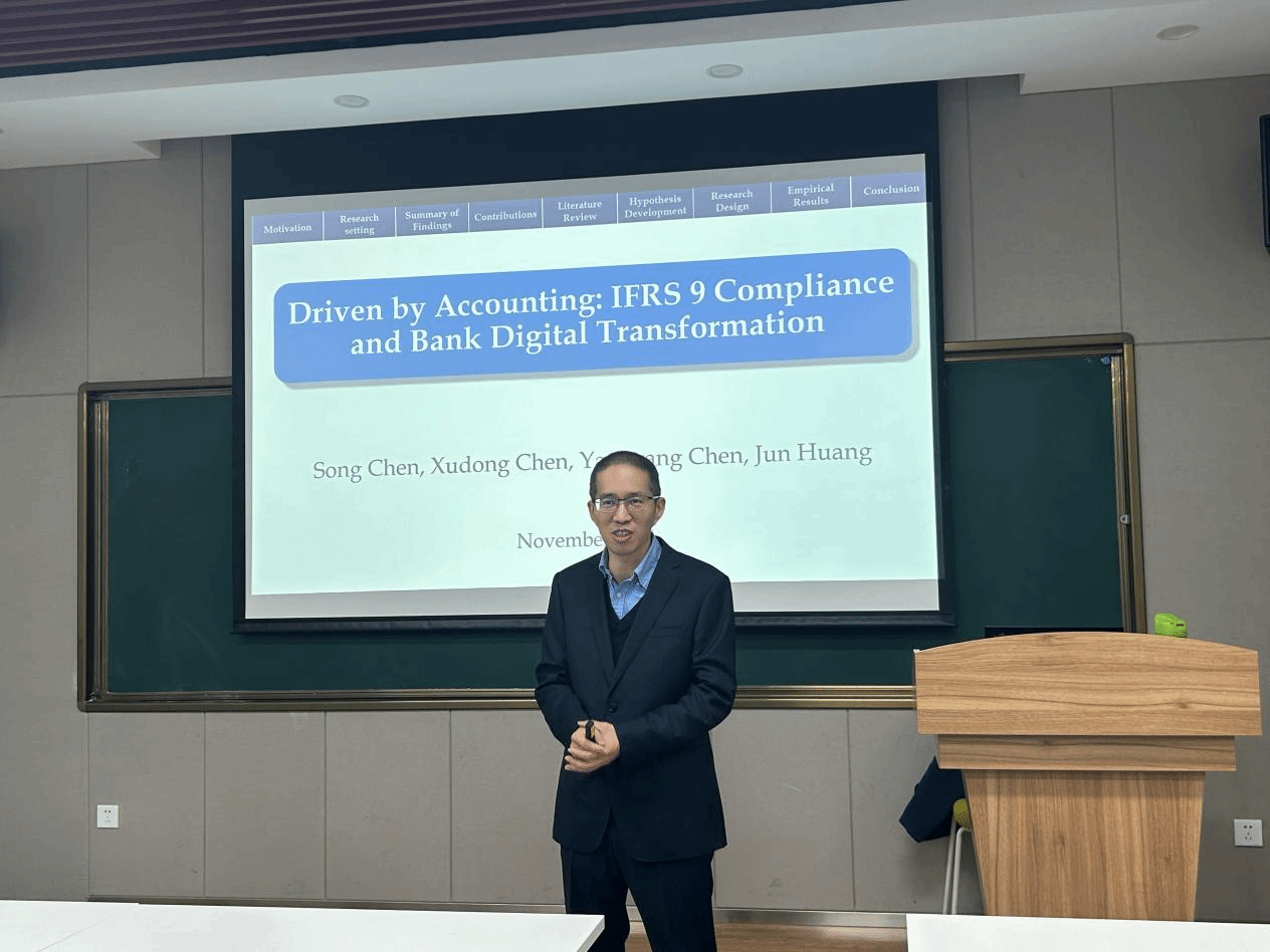 11月12日上午,应JavLibrary 邀请,上海财经大学黄俊教授在长安校区JavLibrary 楼214报告厅与JavLibrary 师生展开学术交流,作题为“Driven by Accounting:IFRS 9 Compliance and Bank Digital Transformation(会计驱动:IFRS 9合规与银行数字化转型)”的学术报告。本次报告会由JavLibrary 田皓文副教授主持,JavLibrary 部分师生参加。