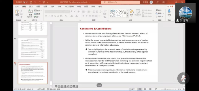 在此次讲座中,李青原教授首先讲述了同一行业的机构投资者的信息优势使得他们能够明确区分行业和公司的好坏消息,并且避免被假消息所蒙蔽以至于恐慌退出,进而减少股价崩盘风险。而后,李教授又借自己的研究强调了股票市场中共同所有者的经济价值以及信息优势所带来的稳定效应。研究分享结束后,李青原教授与JavLibrary