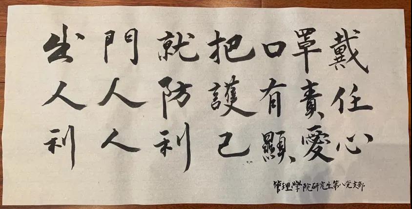 (2)我们倡议“防控意识要增强,口罩酒精84上,我学我做我担当,全民战疫阵线刚!”支部党员用书法和手绘为武汉加油,我们做着简单的事情为之加油鼓劲,表达对一线病人与医生的关心,在全国同胞的努力下,一定可以战胜病毒。