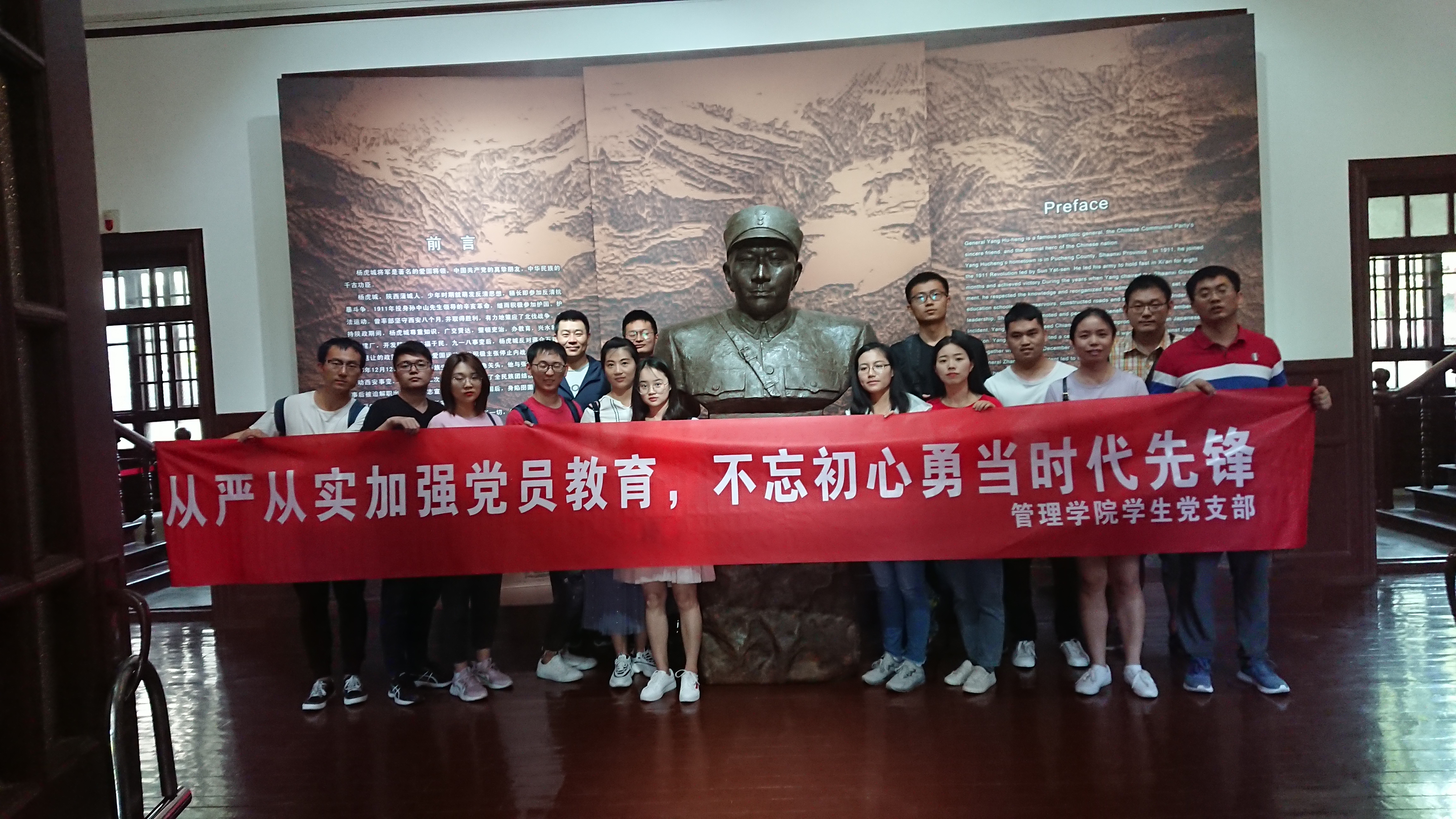 学生党员在长安校区集合,经过一个半小时的车程,到达杨虎城将军的纪念馆,走进纪念馆,入口处写着几个刚劲有力的大字“虎将雄风一世豪”。纪念馆简介概括出杨虎城将军的丰功伟绩。杨虎城将军为了抗日民族统一战线的建立,不畏个人安危,不怕未来坎坷命运,发动西安事变,可谓是居功至伟。展厅内是杨虎城将军的塑像,威武雄壮,令人敬仰。墙面上记录着与杨将军相关的历史资料和珍贵照片。楼内还陈设着杨虎城将军的遗物和西安事变的部分文件,包括将军的指挥刀、穿过的军服、留下的书信与墨宝等。