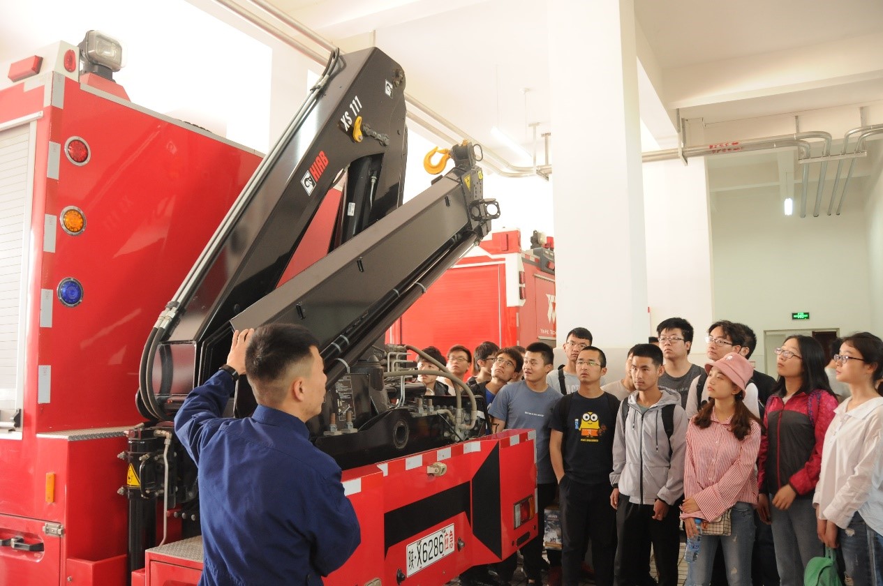 上午九时,学生们乘车来到消防支队。同学们在消防战士的引导和讲解下,首先观摩了特种消防车辆和特种作业装备。水罐消防车、云梯消防车、器材消防车和救生筏、救生衣依次展现在同学们眼前,在聆听了消防员一个又一个救援故事后,同学们深刻体会到消防工作的重要性与危险性,领悟到消防员的艰辛与付出。