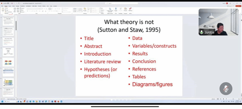 战略管理系夏军(XIA Jun)教授线上讲授了《组织和战略理论》前沿课程,从“什么不是理论”这个引人入胜的话题切入,围绕“论文的各个部分是否为理论”这一问题,进而提出自身对理论以及如何构建理论的理解,并讲述了在学术研究中如何应用理论、如何作出理论贡献等。夏军强调,每个学者都有最符合自己思维模式和研究兴趣的理论,可以选择在自身最有天赋和感触最深的某个理论领域深耕;也可以选择从现象入手,广泛地学习和结合多种理论进行研究。