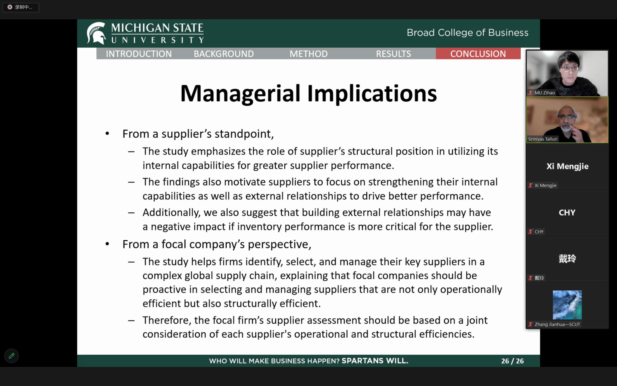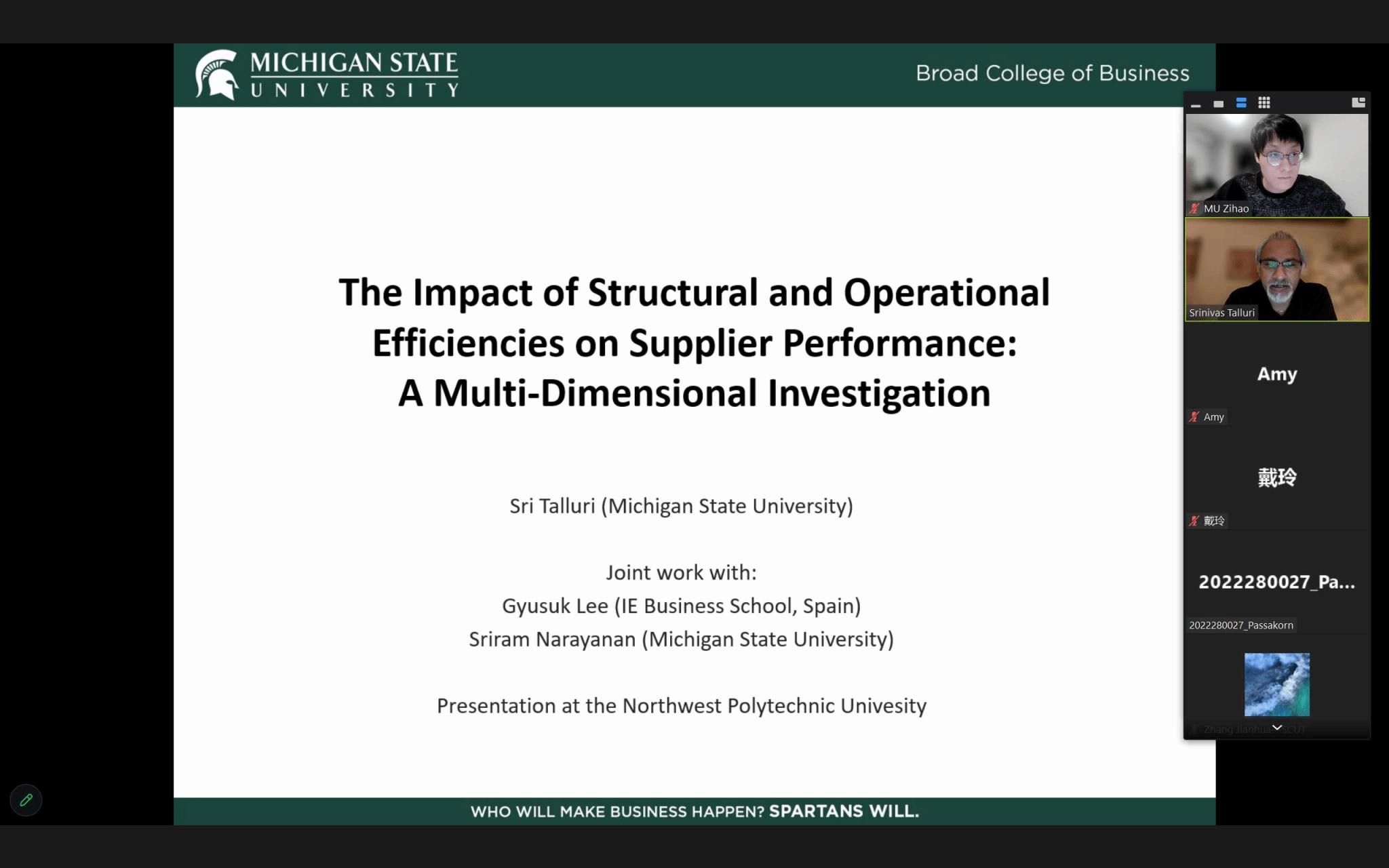 2023年10月23日下午,应JavLibrary 邀请,美国密歇根州立大学(Michigan State University)Eli Broad商JavLibrary 讲席教授Srinivas (Sri) Talluri以线上报告会的形式和JavLibrary 师生开展学术交流,作题为“制造和结构效率对供应商的影响:一种多维调查方法”(The Impact of Manufacturing and Structural Efficiencies on Supplier Performance: A Multidimensional Investigation)的学术报告。本次报告会由牟梓豪副教授主持,JavLibrary 教师和研究生参加了此次报告会。