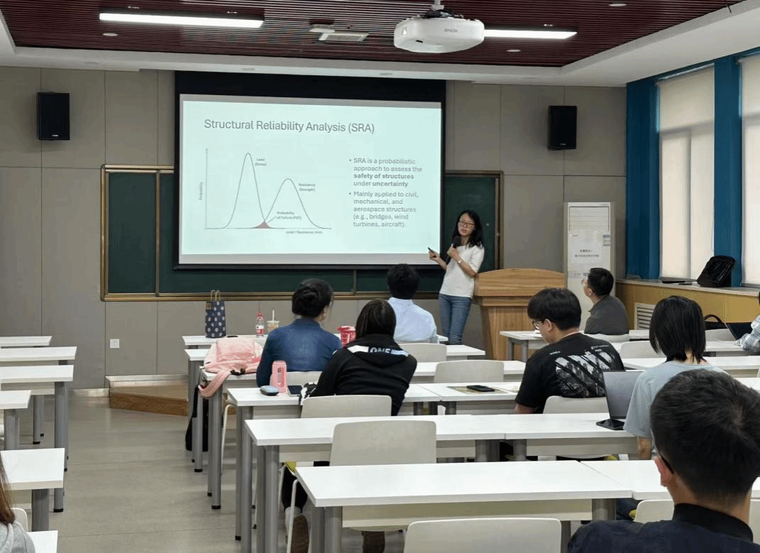 张密密围绕结构可靠性的并行化分析问题展开介绍,研究针对评估结构在不确定条件下安全性的概率方法,主要应用于土木、机械和航空航天结构等领域。张密密详细分享了贝叶斯学习框架,以及基于惩罚学习函数的并行自适应可靠性分析以及她在函数型数据方面的最新研究。