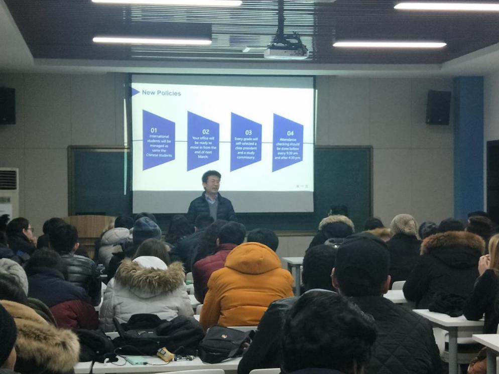 辅导员姬老师、韩老师对留学生日常生活学习管理进行简单说明,韩老师尤其强调留学生在华安全问题以及非法打工问题,指出学生应以学业为重,遵守中国法律法规。