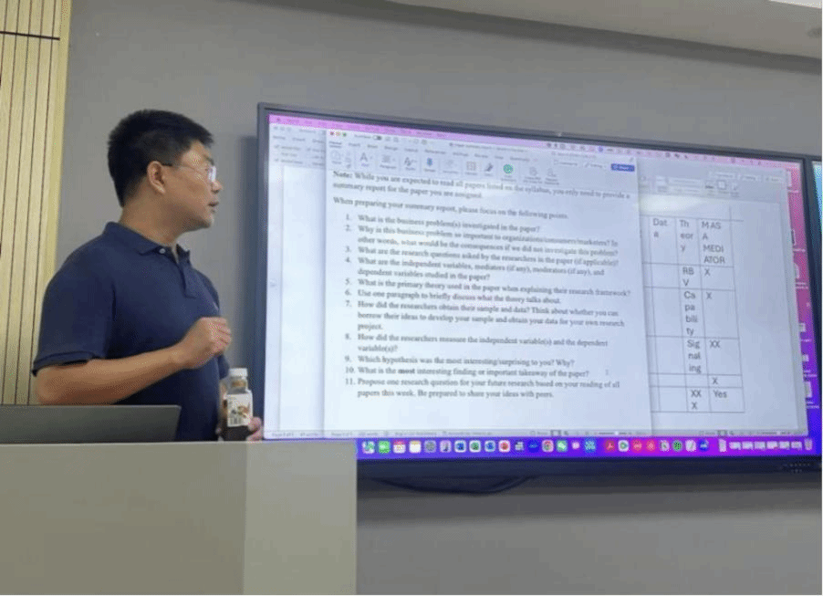 6月30日-7月11日,美国西弗吉尼亚大学王新春副教授开设了为期两周的《营销战略》课程。该课程在涵盖个体、群体、企业、组织间及产业等多维分析层级的视角下,对营销战略相关研究的理论,常用研究方法,以及论文写作等进行深入的研究和探讨。课程涵盖理论构建方法论、营销与营销战略的本质、交易成本与代理理论、创新与新产品开发、营销与财务交叉研究、营销与创业管理等多个方面,采用论文分享与汇报、分组讨等形式,让学生系统性地了解营销战略研究的基础框架,熟悉近期营销战略领域的研究动态。