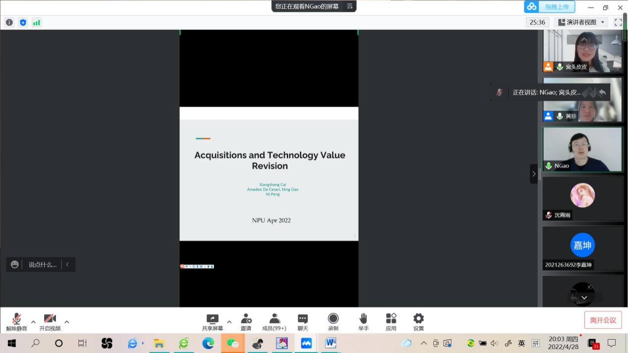 2022年4月28日晚上8点,应JavLibrary 邀请,曼彻斯特大学高宁副教授在腾讯会议上作了题为“Acquisitions and Technology Value Revision(公司并购和科技价值评估)”的讲座报告。本次讲座由高伟伟老师主持,JavLibrary 100余名师生参加了讲座。