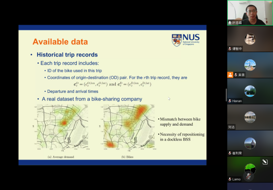 此次报告会,叶志盛首先分析了无桩自行车共享系统数据驱动管理的现状与痛点,为解决共享单车供应和出行需求之间的不匹配及自行车易受损的现状,他及其团队开发了一种新颖的数据驱动方法,该方法可以捕捉无桩自行车共享系统的动态变化,具有高度可扩展性。进一步,制定随机网络流模型,完成对自行车故障概率的定期估计。然后,叶志盛基于线性程序确定自行车的最佳分配方案,实现未来客户出行的预期次数最大化。最后,叶志盛综合之前的分析结果来制定维护和重新定位的车辆路径规划问题,并通过整合强化学习和优化解决该问题。该研究使用亚洲最大的共享单车公司之一提供的数据进行了广泛的数值实验以探索管理影响,为维护和重新定位城市道路网络的路由问题提供了解决方案。