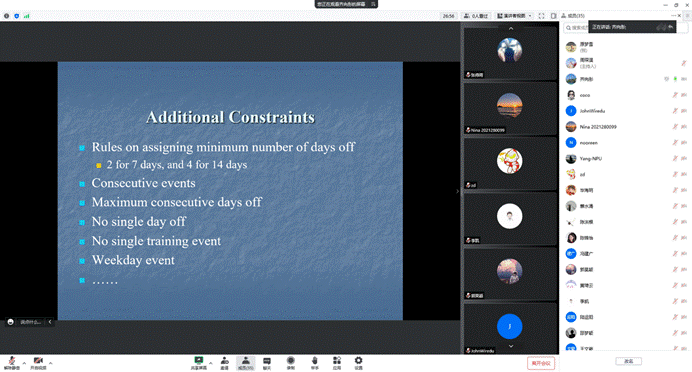 师生深入了解了运筹学是如何为行业创造价值,以及工业项目如何与他的学术生涯发展相结合并产生的巨大回馈,为大家提供了一次良好的学习交流机会。
