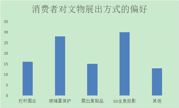 在展出方式上,数据显示,喜好玻璃罩保护这种较常见的方式和3D全息投影这种较先进的方式的人数最多,而喜好展出复制品的人数最少。在此数据统计中我们发现,人们更喜欢看到真实的,有历史意义的景观和文物,同时也希望看到3D投影之类的有科技含量的展出方式。因此在景观展示中尽量以历史遗存的原始景观为主,展出文物则主要以较常见的玻璃罩保护和3D全息投影为主。