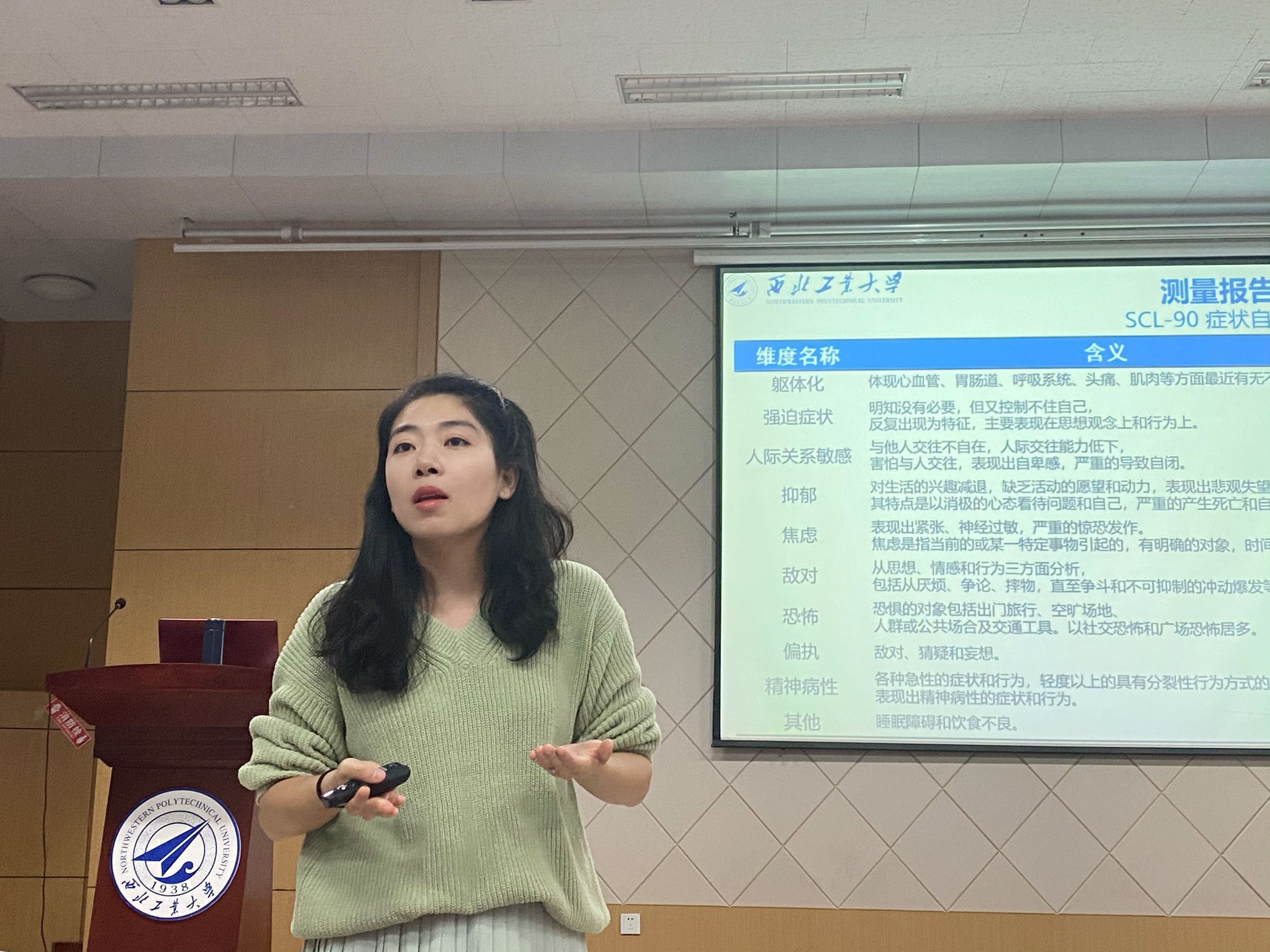 在心理测试结果讲解环节,戴老师给大家对测评哭卷SCL-90症状自评量表,16PF卡特尔16种人格测验进行了相关的介绍和详细的分析,帮助大家判断自己的心理状况、及时调整自己的消极情绪与心理问题,并给出了调节心理的方法——积极应对,重构认知,寻求帮助。