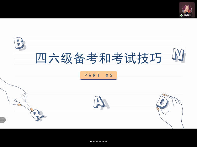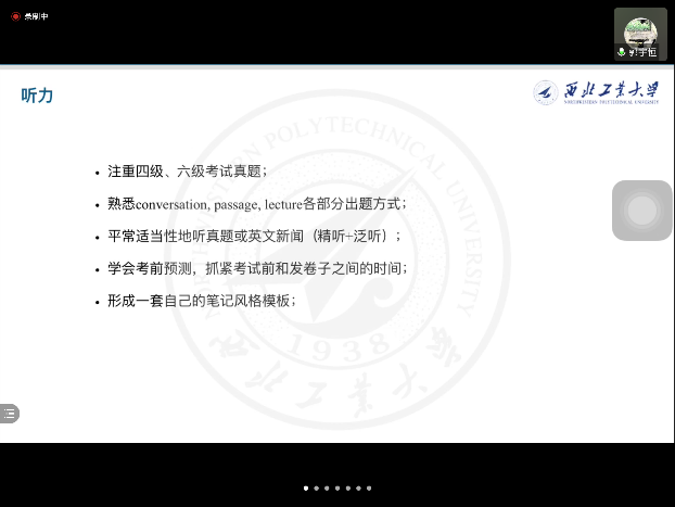 接下来进行分享的是郭宇恒同学,他结合自身的四六级备考经验,从听说读写四个部分来展开。