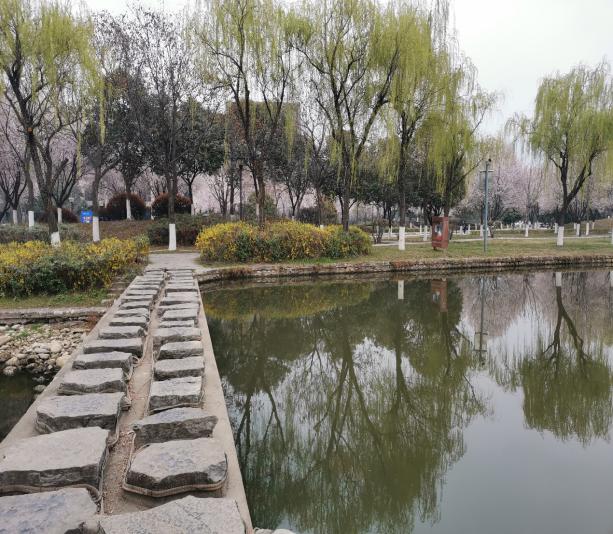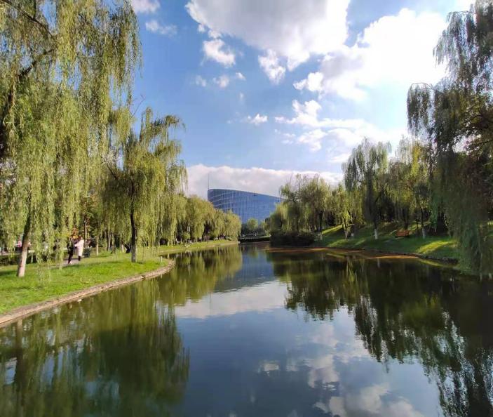 图书馆启翔湖旁拍摄的校园美景