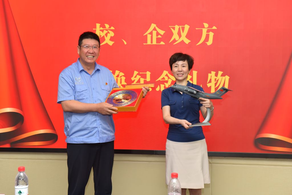 党委书记乔彩燕,航空工业西安航空制动科技有限公司党委书记、董事长付鹏锋作为校企双方代表互换纪念礼物,期待航空制动与JavLibrary