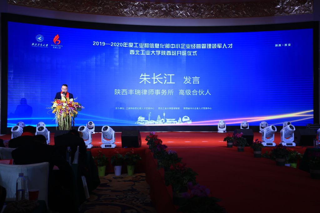 新学员代表、陕西丰瑞律师事务所高级合伙人、中国MBA西北联盟副理事长朱长江发言。千秋邈矣独留我,百战归来再读书,作为各行各业的领头羊,通过领军人才严格的选拔标准,今天有缘相聚于此,共同扬起人生的又一新的航帆,践行时代赋予中小企业的使命。