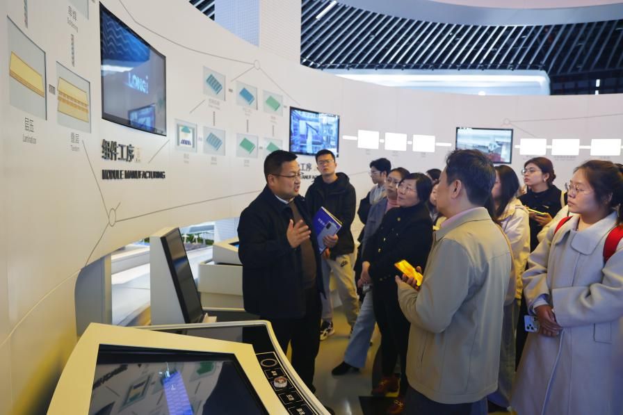 师生们首先参观了智慧能源展厅。展厅以“向阳而生”为主题,在工作人员引导下,师生们穿越了时空隧道,感受从柴薪到可再生能源的能源变革史,了解各类能源储量差异,沿着世界与中国两条线索,了解了光伏产业的诞生与隆基的创立故事,学习了晶料生长、光伏制氢的原理,领略了光伏在宇宙、智慧城市、家庭等场景的应用,对绿色能源产业发展进行了深入了解。