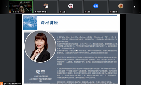 企业导师、中科曙光集团副总裁郭莹女士进入课堂,做了《全球治理新时代的跨国企业管理》的课程主题分享。郭莹女士结合自己丰富的跨国企业工作经历,以全球宏观形势与新经济、科技创新与新基建、科技成果的特征理解和转化之路、跨国公司的组织体系、跨国经营中的跨国文化管理、跨国经营中的法律法规风险管理等内容为主线,分享了她在国际合作领域的独特见解,并解答了同学们所关注的问题。郭莹女士精彩的职场经历,开放前瞻的国际合作素养和丰富的多文化沟通与交流经验,让同学们深受启发和激励。