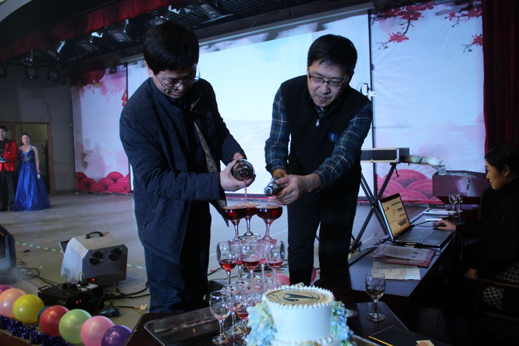 随后,研究生院副院长晁小荣老师和校友总会秘书长张英群老师各执香槟为晚会送祝福,香槟流长,溢满香槟塔,寓意晚会一帆风顺,祝愿同学们新年如意!