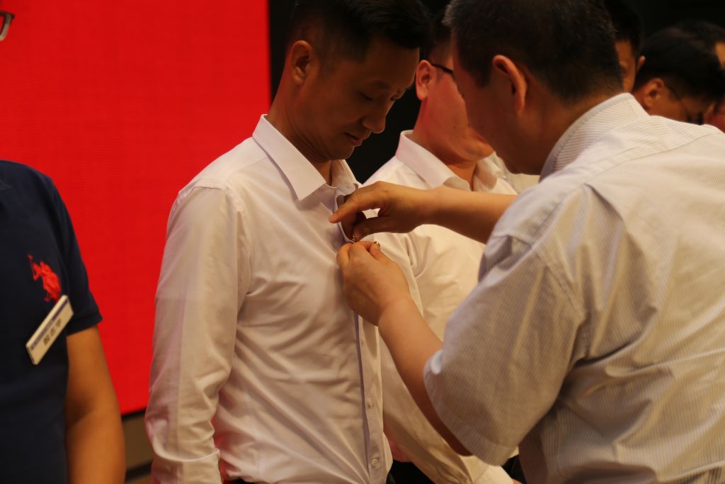 接着,与会领导为10名新生代表佩戴校徽。校徽上的三航标志在灯光的映衬下散发着光辉,有冲破陈规约束、大胆创新、永攀高峰、锐意进取的寓意。戴上它,同学们从此成为了西工大的一员。